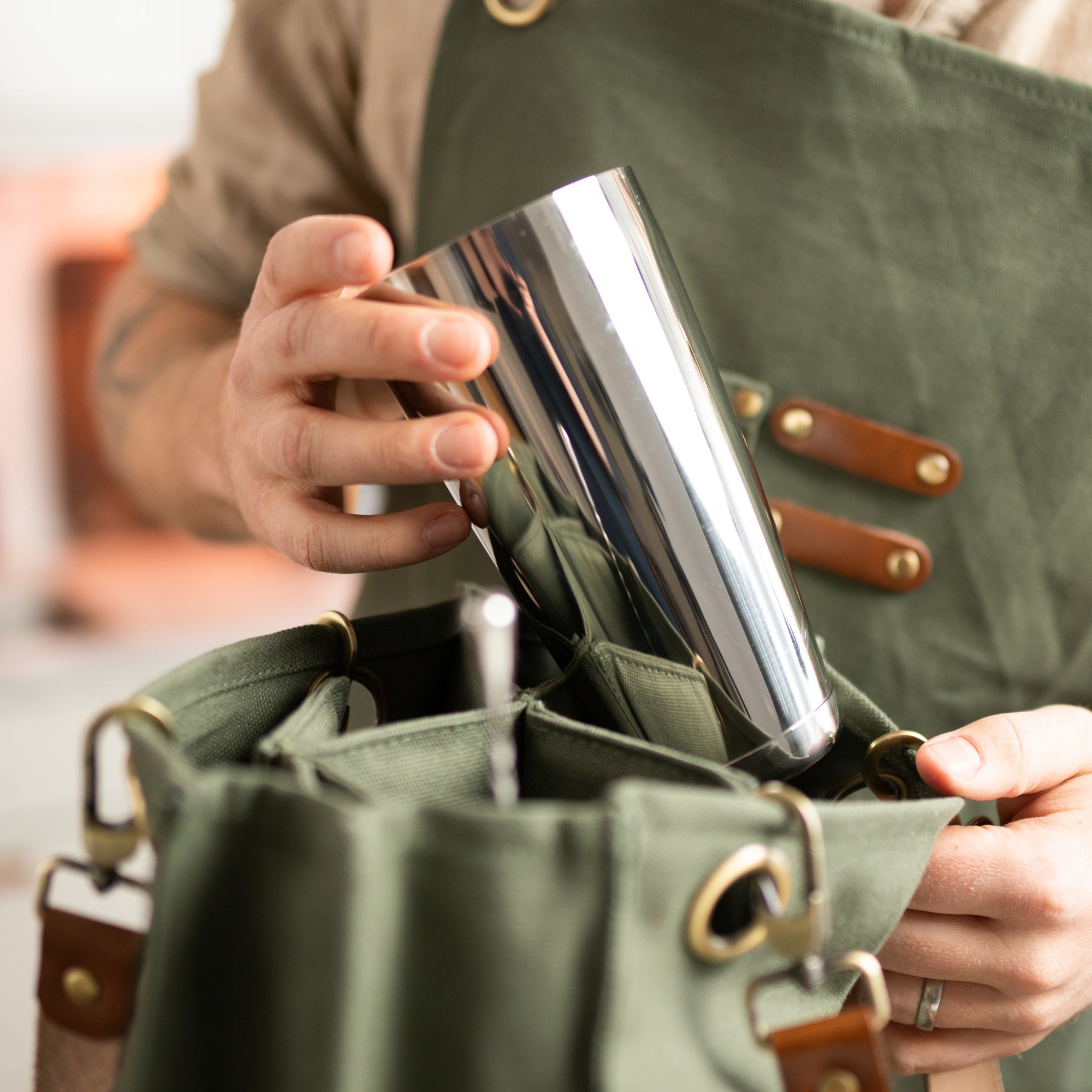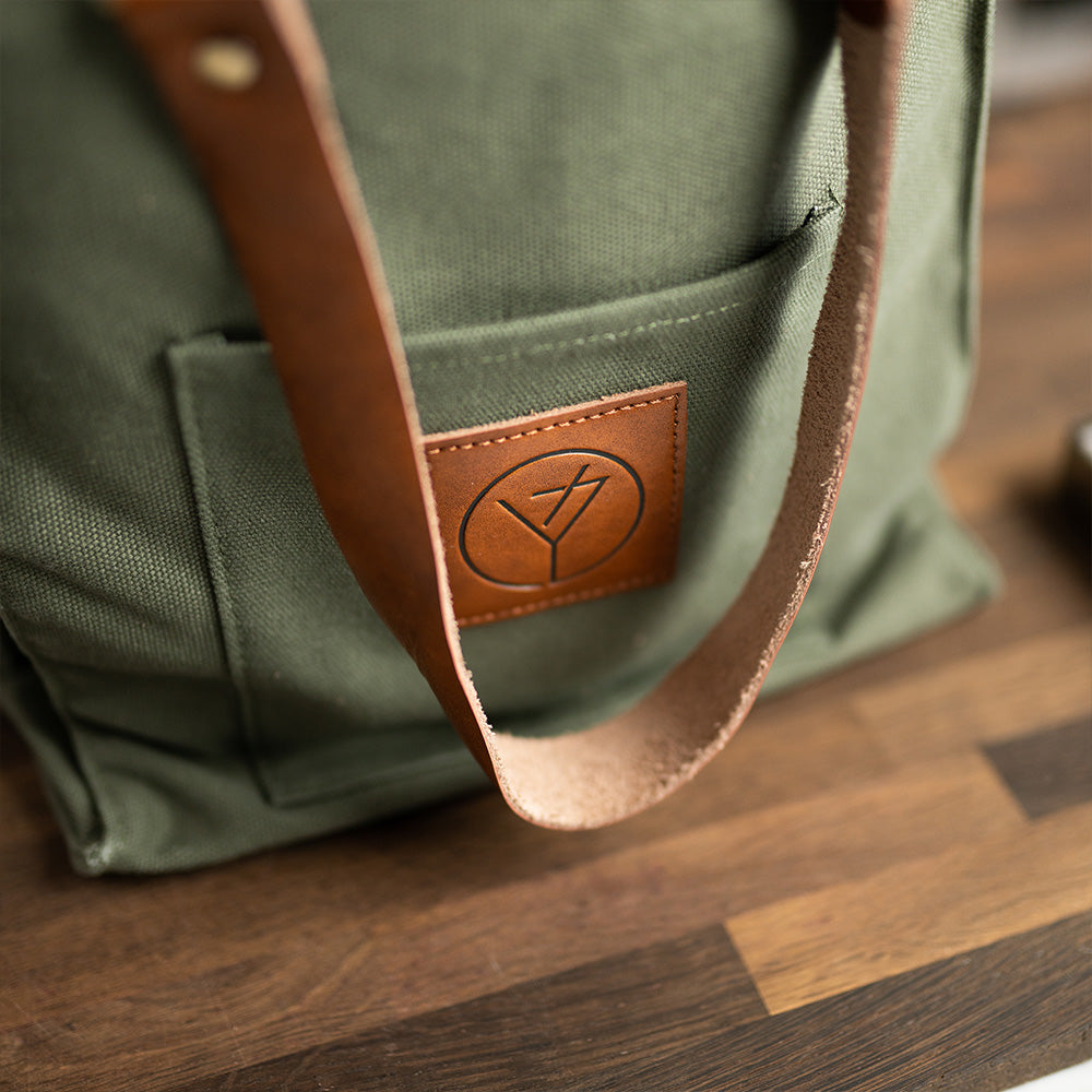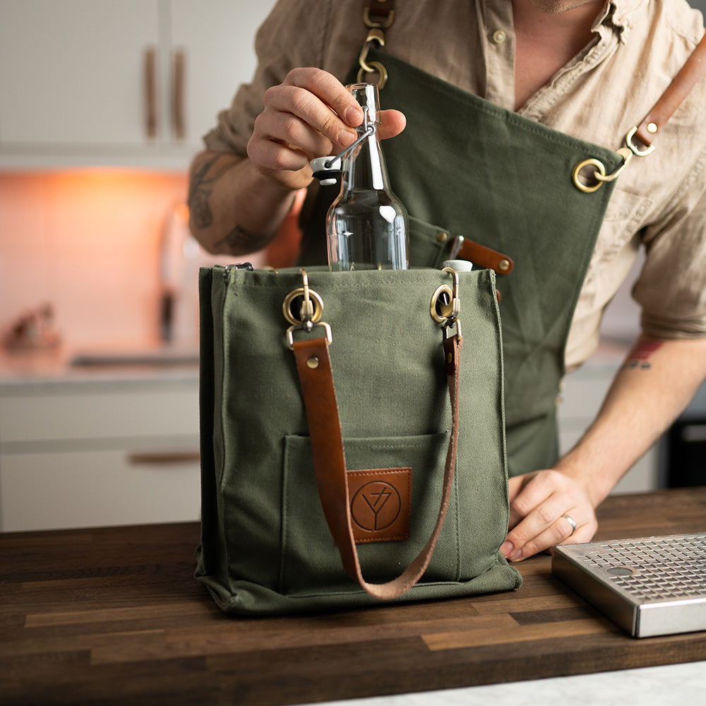 En rejäl kanvasväska i grönt tyg, med detaljer i läder. Väskan är avsedd för att bära 6 st 70 cl flaskor eller dina barvektyg i. Vadderade avdelare skyddar innehållet i väskan. Remmarna är gjorda av läder och fäster i förstärkta öglor för bästa möjliga hållbarhet.