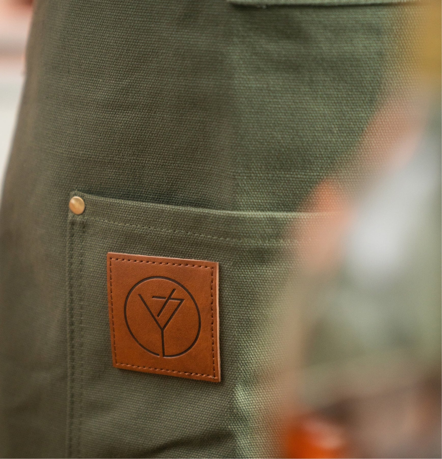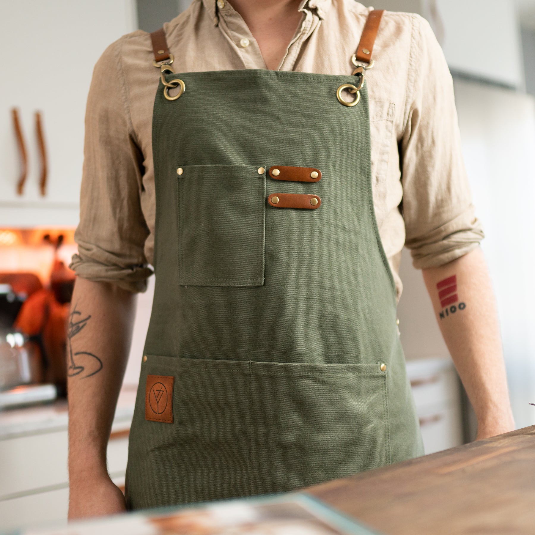 Ett robust förkläde i grön kanvas med och detaljer i brunt läder.