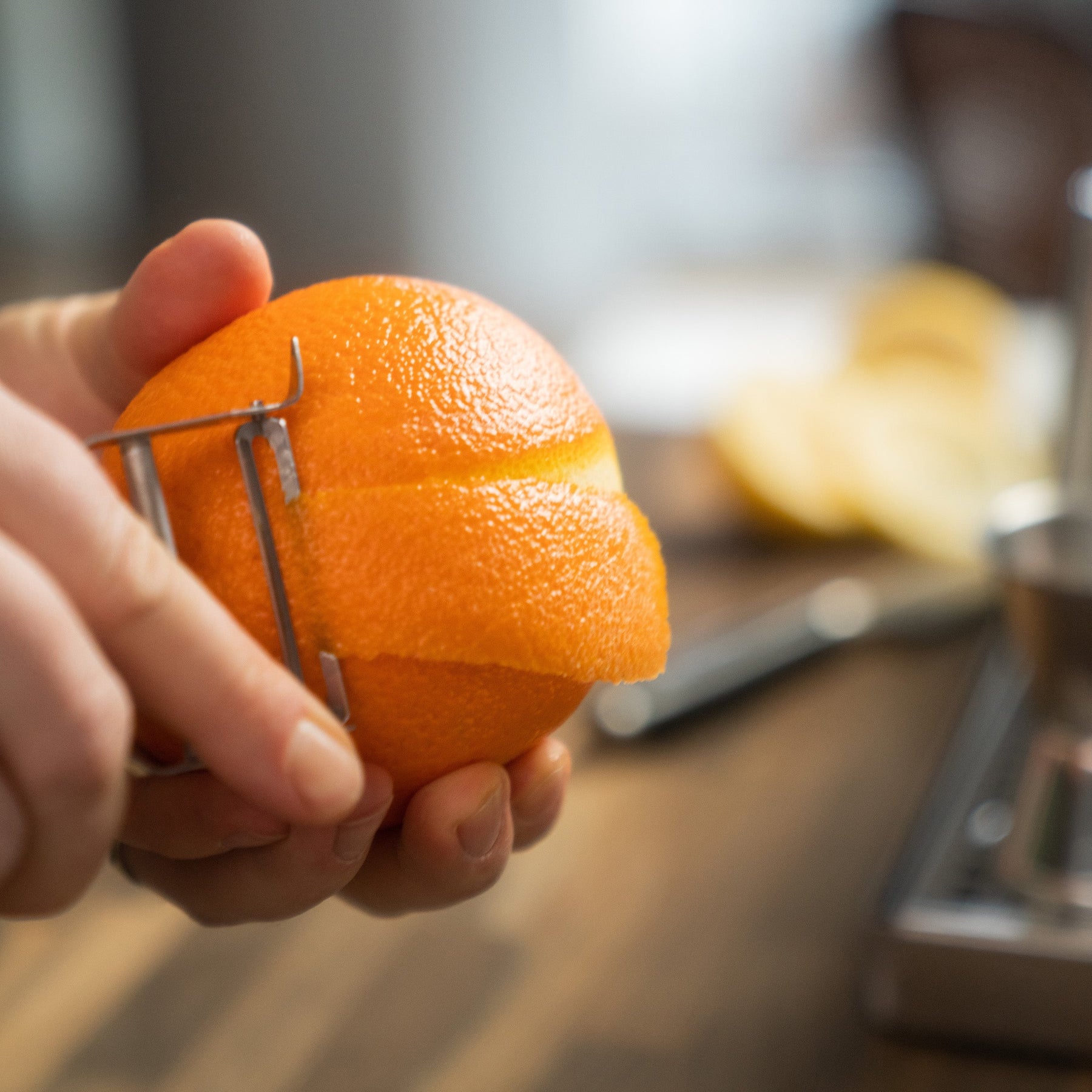 Ett perfekt verktyg för att lyckas med breda skal att garnera dina drinkar med. Den gör det lättare för dig att pressa oljorna ut skalet över drinken.